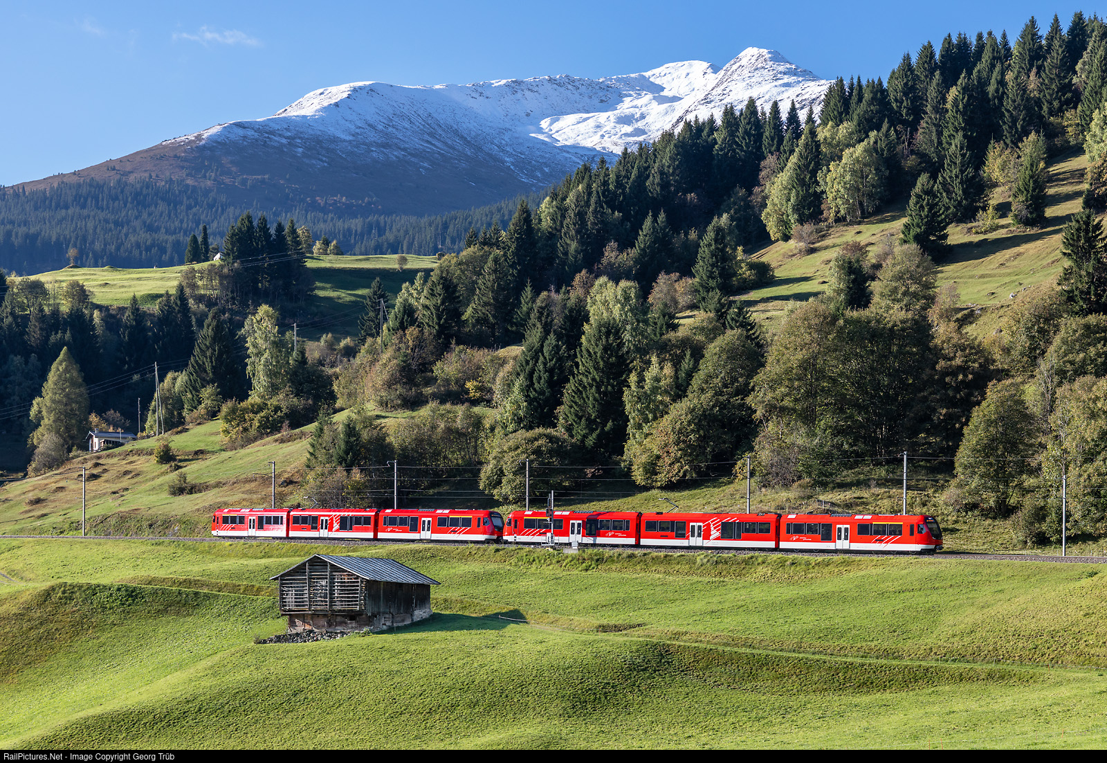 | ORION cogwheel trains ABeh 8/12 # 311 and # 304 of the Matterhorn-Gotthard-Bahn (MGB) in multiple control are running the R45 service 820 from Brig via Andermatt-Oberalp pass-Sedrun to Disentis/Mustér, between Mompé-Tujetsch and Segnas. In the background snow covered Piz Pazzola (2581 meter a.s.l., left) and Piz Ault (2454 meter a.s.l.). First snow came three days before. |