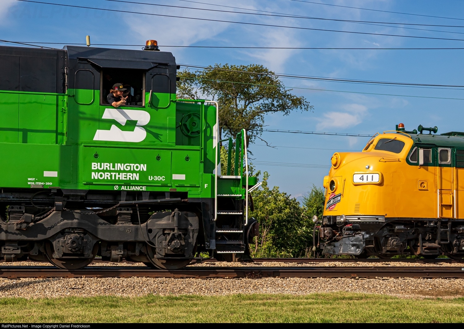 | During the Illinois Railway Museum's 2025 Diesel Days event, BN 5383 (U30C) returns from a Take the Throttle run and meets CNW 411 (F7A), which is inactive today, merely sitting at the station with the bilevel train (to be used later during the weekend). |