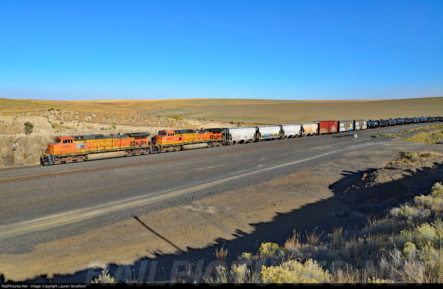 | BNSF 4052 E/B with a mixed freight about to crest the grade on Providence Hill, WA on September 29, 2024. The second unit is BNSF 5425. |