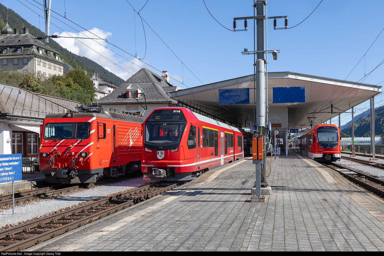 RailPictures.Net Photo: 107, 3118, 304 Matterhorn-Gotthard Bahn (MGB) HGe 4/4 II, ABe 4/16, ABeh 8/12 at Disentis, Switzerland by Georg Trüb