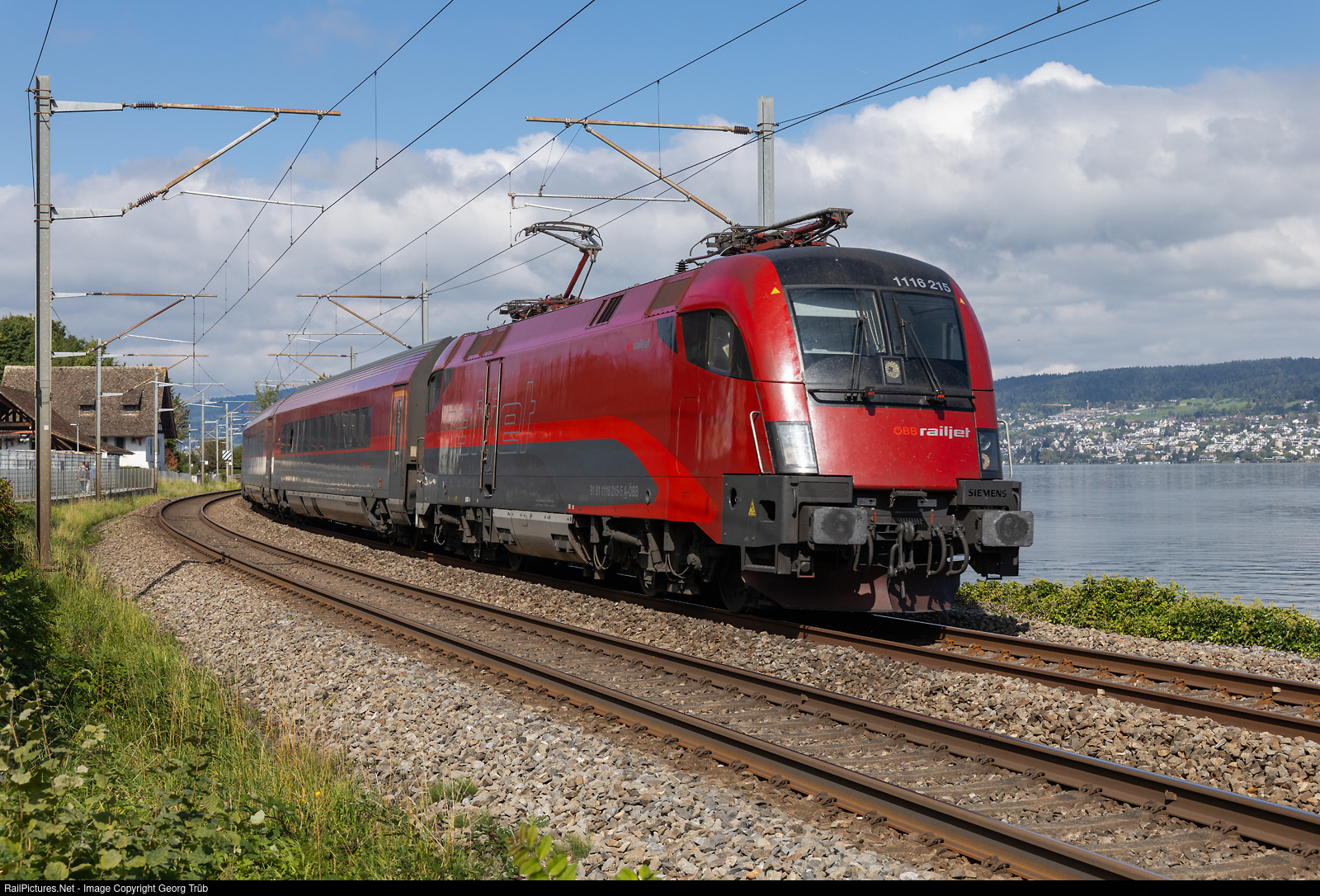 | 1116 # 215 of the austrian ÖBB pulls the RailJetExpress 167 from Zürich via Vienna to Bratislava main station along the shore of Lake Zürich between Wädenswil and Richterswil. |