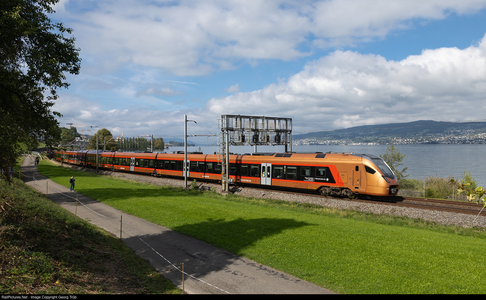 "Traverso" train RABe 526 # 113/213 of the Südostbahn (SOB) is running the IR 2370 of the line IR35 AARE LINTH Chur-Zürich-Bern along Lake Zürich between Richterswil and Wädenswil.