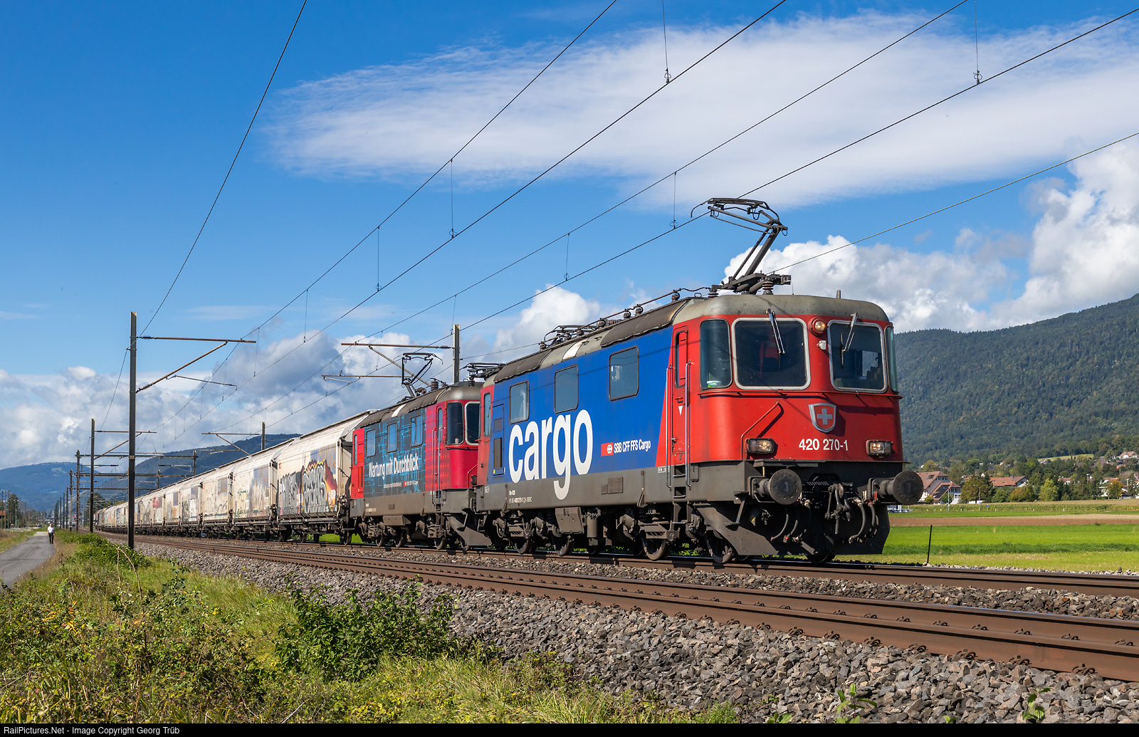 | Freight train 60021 of the SBB Cargo from Lausanne shunting yard (Lausanne Triage) via Neuchâtel-Biel-Olten to the Limmattal shunting yard (RBL, Rangierbahnhof Limmattal) is seen between Bettlach and Selzach on the Jura moutain range foot line. Pulling are Re 420 # 270 (Re 4/4 II # 11270) and Re 420 # 345 (Re 4/4 II # 11345) in the special paint scheme "Wartung mit Durchblick". |