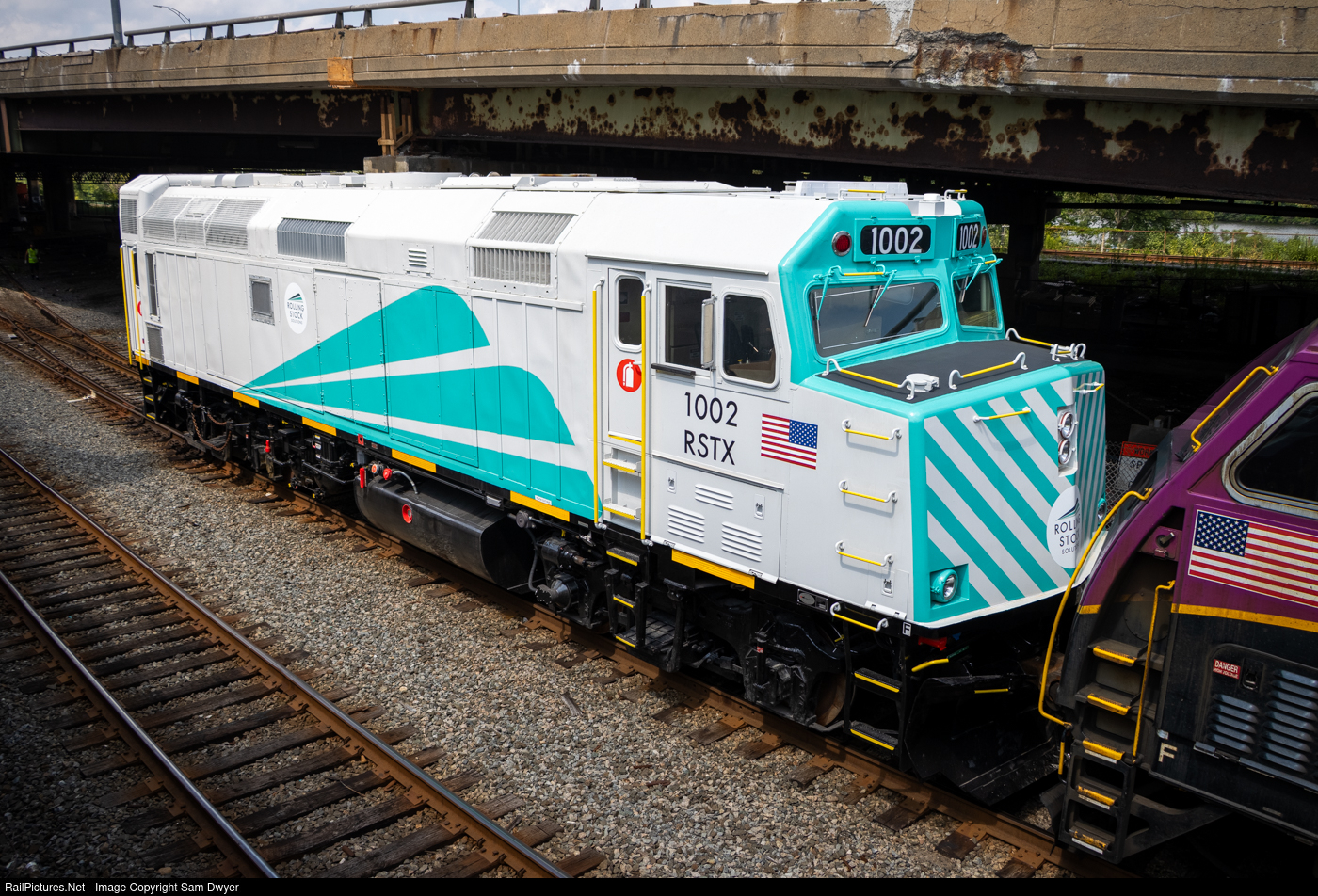 RSTX 1002 is the first of 6 F40PH-4Cs leased to the MBTA by Rolling Stock Solutions, a Boston-based startup that remanufactures ex-Amtrak F40s to offer commuter rails a quick solution to power shortages. On August 17th, the Readville switcher made a trip out to Framingham to pick this unit up, and thanks to apparent cab signal and brake issues in Newton, I was able to catch up to them in Boston at the 3.3 switch.