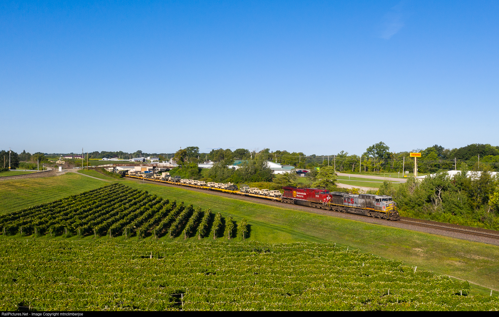 | It’s a sunny morning in North East, Pennsylvania as loaded military train S568 makes a run east over the CSX Erie West Subdivision bound for Fort Drum in Watertown, New York. A gray KCSM AC4400CW and CP AC44CWM lead the way as the train passes under the Bort Road bridge and past the vineyards along Lake Erie. |