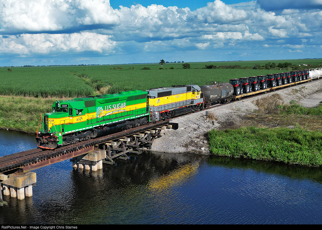 | SCFE's westbound Ft. Pierce Turn crosses the Miami Canal at Lake Harbor, FL with inbound interchange traffic from the FEC including new tractors for a local farm equipment supplier. |