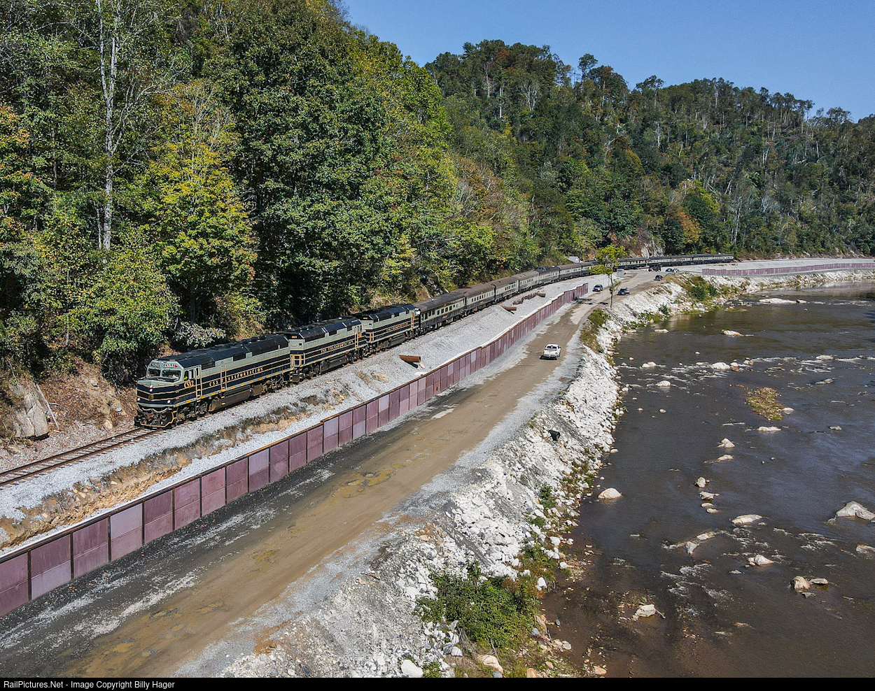 Northbound CSX P001, with a deadhead move of the office car special bound for an event in Erwin, passes between Piegonroost and Huntdale, North Carolina on their trip North along the Toe River. This whole area of track, along with NC Route 197 below, was wiped out due to flooding caused by Hurricane Helene. As mentioned in the other days post, the line just reopened this past week for revenue service after being out of service for a year. CSX built the new flood wall along this couple of mile stretch of track, and has their track in prime operating condition.