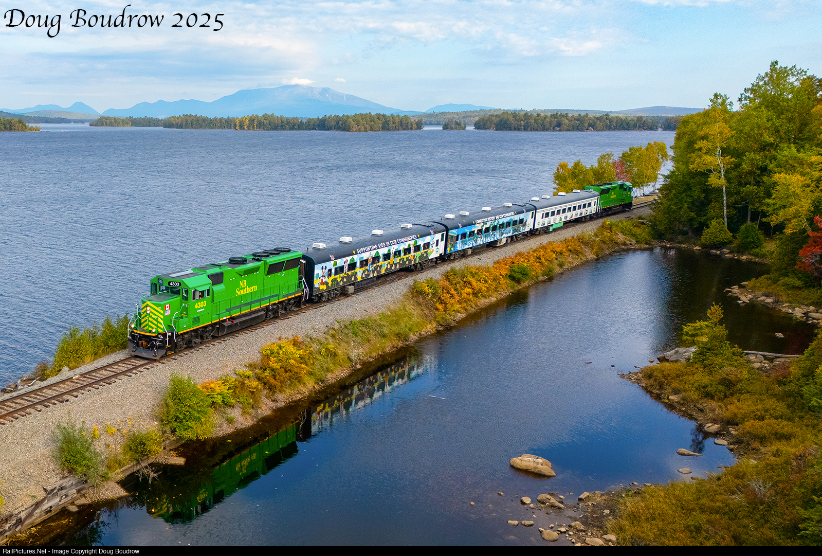 | The trailing unit is running along South Twin Lake on the Northbound run with the 8:30 AM sold out public excursion. The 5,269 foot Mount Katahdin is seen looming in the background. The train ran South to Cedar Lake Road before changing directions to return. |
