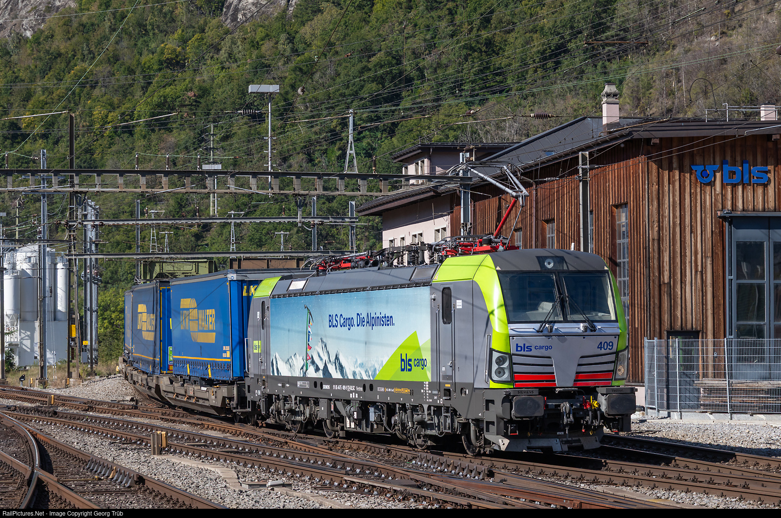 | This is the about 1690 gross ton northbound intermodal train 43534 of BLS Cargo from Gallarate/Italy via Domodossola-Simplon tunnel-Brig-Lötschberg mountain line-Spiez-Zollikofen-Olten-Basel to Geleen Luchterade/Belgium, leaving Brig (without stop in Brig). In the rear of the heavy train is pusher Siemens "Vectron" Re 475 # 409 of BLS Cargo, running from Domodossola II freight yard till Spiez. In front of the train were Re 465 # 013 of the BLS and Siemens "Vectron" 193 # 714 (91 80 6193 714-3 D-DISPO) of Beacon Rail, rented to BLS Cargo, in multiple control. |