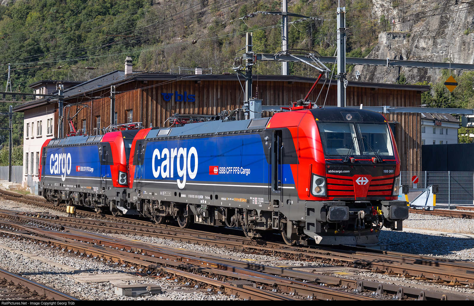 | Siemens "Vectron" locomotives 193 # 061 and # 074 of the SBB cargo in multiple, leased from LokRoll3 for 8 years, shunting in Brig. They will pull freight train 60023 afterwards from Brig to the Limmattal shunting yard. |