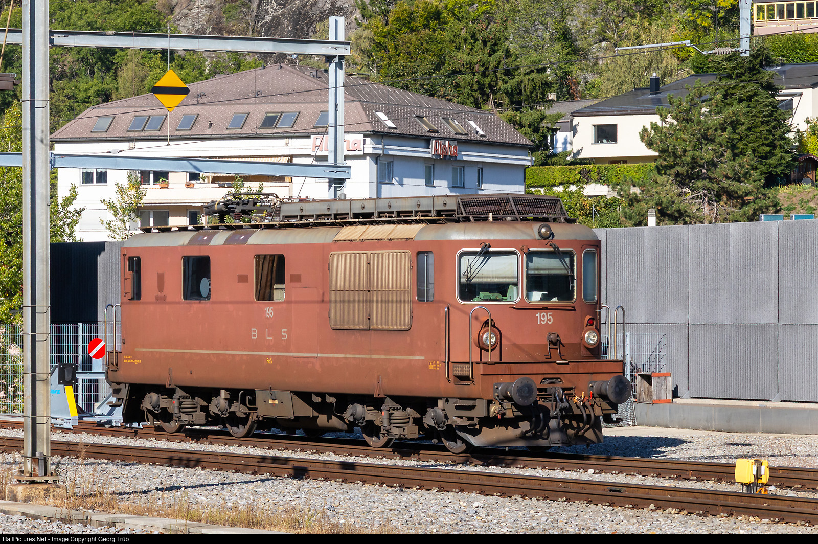 | 4980 kW locomotive Re 425 # 195 of the BLS, built in 1983 by SLM and BBC as last of the series, former adorned with the blazon of "Unterseen", is standing in Brig in front of the shed. |