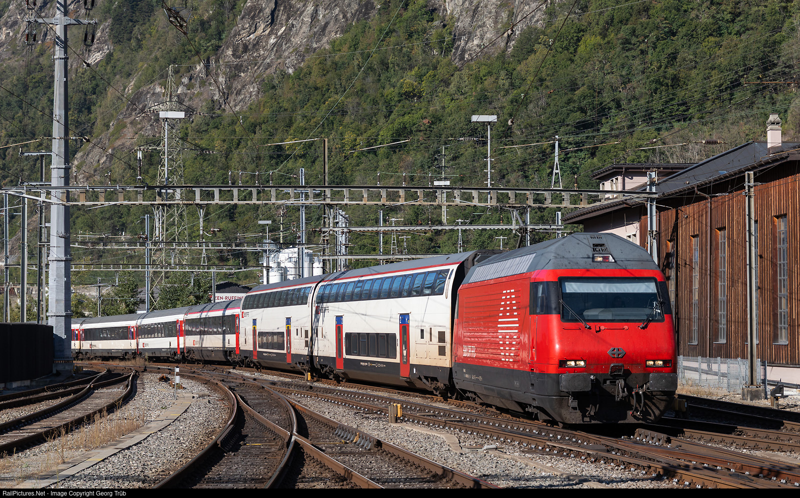 | The IR 1811 of the line IR90 from Geneva Airport via Lausanne-Sion-Visp is entering Brig with unknwon Re 460 locomotive of the SBB. In front of the push-pull train are a second and a first class doubldeck car "IC2000", followed by single deck cars of type EW IV. This serves to comply with the requirements of the Disability Equality Act, as the double-decker carriages allow level access from a 55-centimeter platform. On the other hand, it is not possible to walk through the train, as the carriage transitions are at different heights. |
