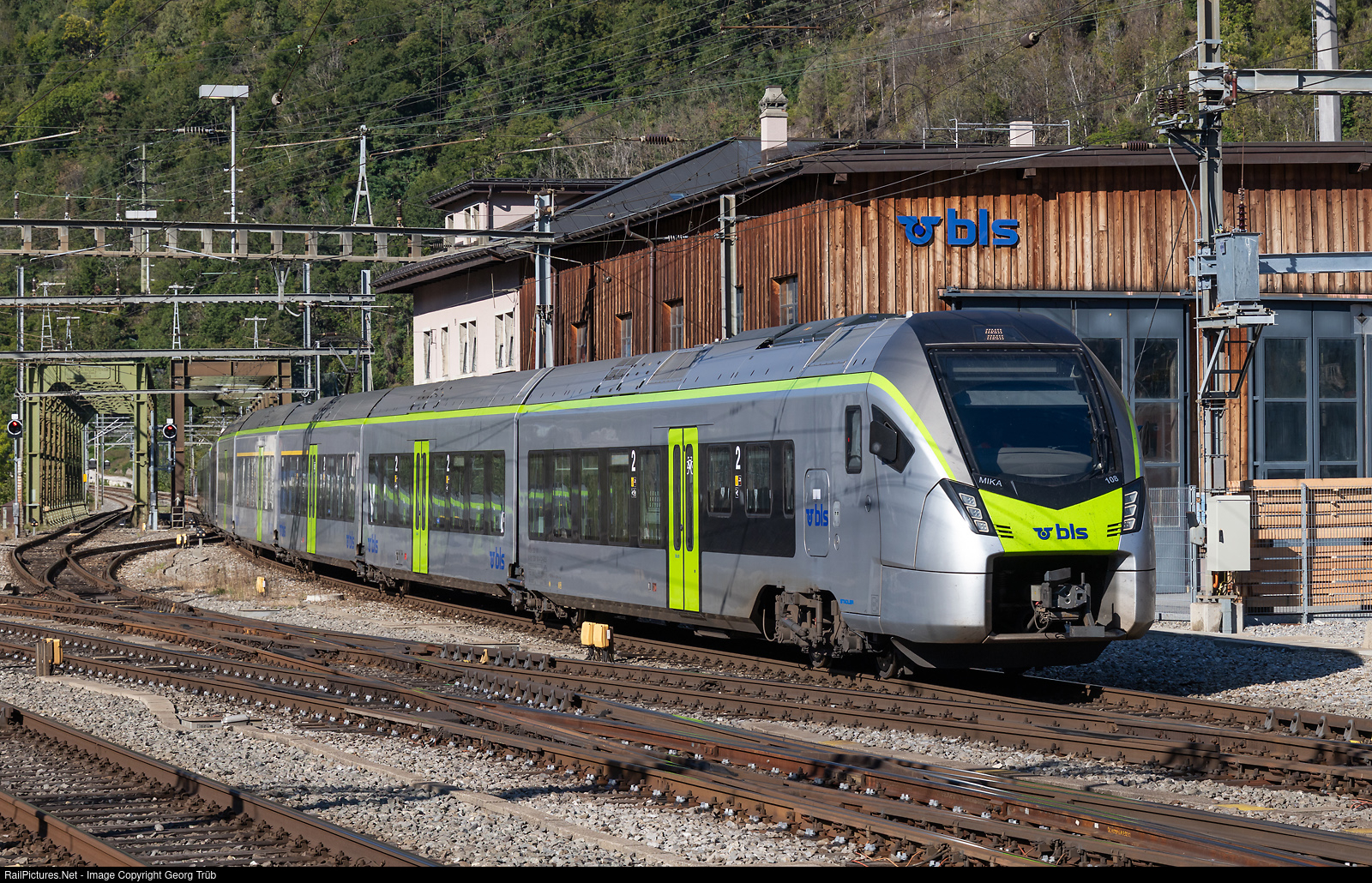 | MIKA RABe 528 # 108 of the BLS is entering Brig, running light as train 33819 from Spiez via Kandersteg to Brig. |
