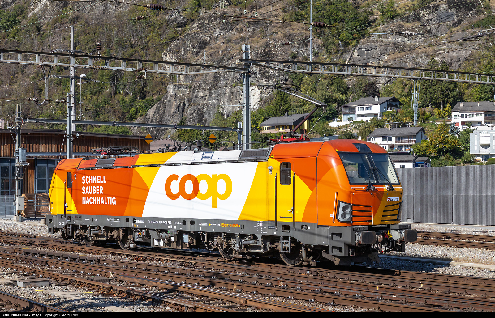 | Siemens "Vectron" with last mile diesel module Rem 476 # 457 "Aargau" of the Railcare railway in the new Coop design (foiles) in Brig. This is the first of the series of seven Rem 476 leased by Railcare from UniCredit since 2018, which got the new design, the others will follow. The Railcare railway is now 100 % owned by the large swiss retailer Coop. Coop aims to shift transport between major suppliers and its warehouses and distribution centers to rail as far as possible. In addition to the seven Rem 476 Vectrons, three Euro9000 locomotives from StadlerRail are in service, along with individual locomotives leased from SBB or BLS. |
