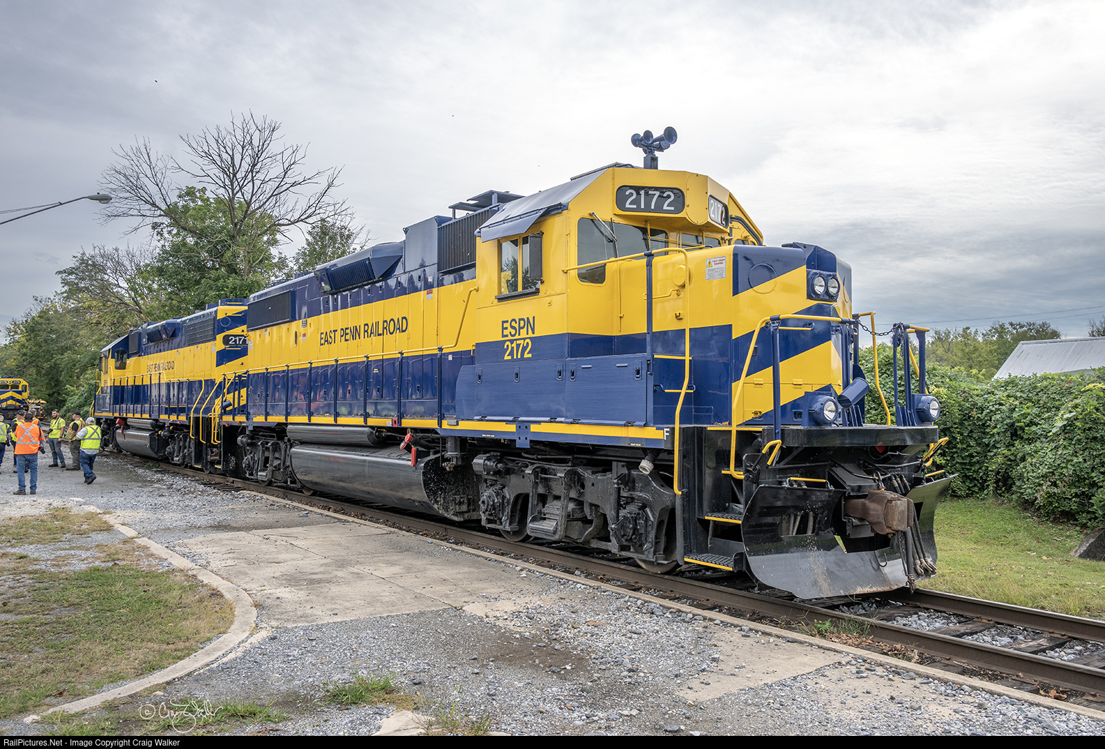 It may be obvious by the (former) locations of the lights, and L-windshield, on East Penn Railroad GP38-2 2172 that this locomotive was built by EMD for the Southern Pacific Railroad. Built in May 1980 as SP 4825, this GP38-2 was the only one of SP's GP38-2s to receive the "Speed Lettering" scheme. Thanks to the acquisition of the SP by the Union Pacific on 9/11/96, becoming UP 588 in December 2004. UP retired this locomotive in October 2023 and it passed through locomotive dealer Metro East Industries (of East St. Louis IL) to East Penn Railroad, becoming ESPN 2172 on November 7, 2023. (Kennett Square, Pennsylvania – September 27, 2025)