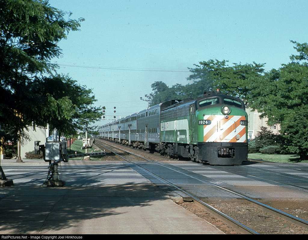 In the twilight of these locomotives' storied careers pulling first Zephyrs, then Chicago commuters, BN 9924 heads westbound late in the afternoon with some of those same commuters, heading home for the day.