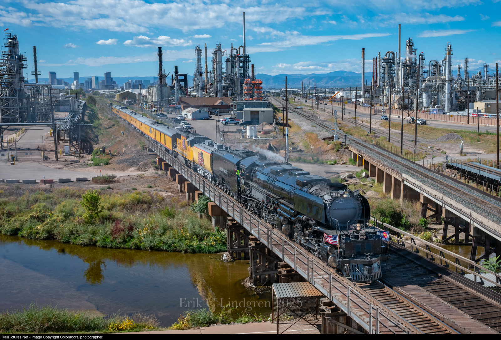 Sand Creek Junction Tough light plagues us on this trip where Union Pacific 4014 with newly installed for this run to Denver from Cheyenne using 3985’s smoke deflectors makes an appearance at Suncor Energy through Sand Creek Junction on October 1, 2025 at 1015.