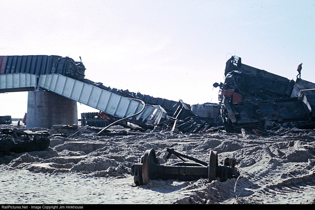 Correction: There are apparently no NTSB/STB reports on this incident. However, on further research, this derailment was not due to flooding, but rather improper slack management by the mid-train helpers. The bridge is over Bijou Creek, just east of Wiggins and just feet south of Interstate 76. The units in the dry drink were probably U23Cs and/or U25Cs (even possibly U28Cs), and at least one of them was still in CB&Q Chinese red livery.