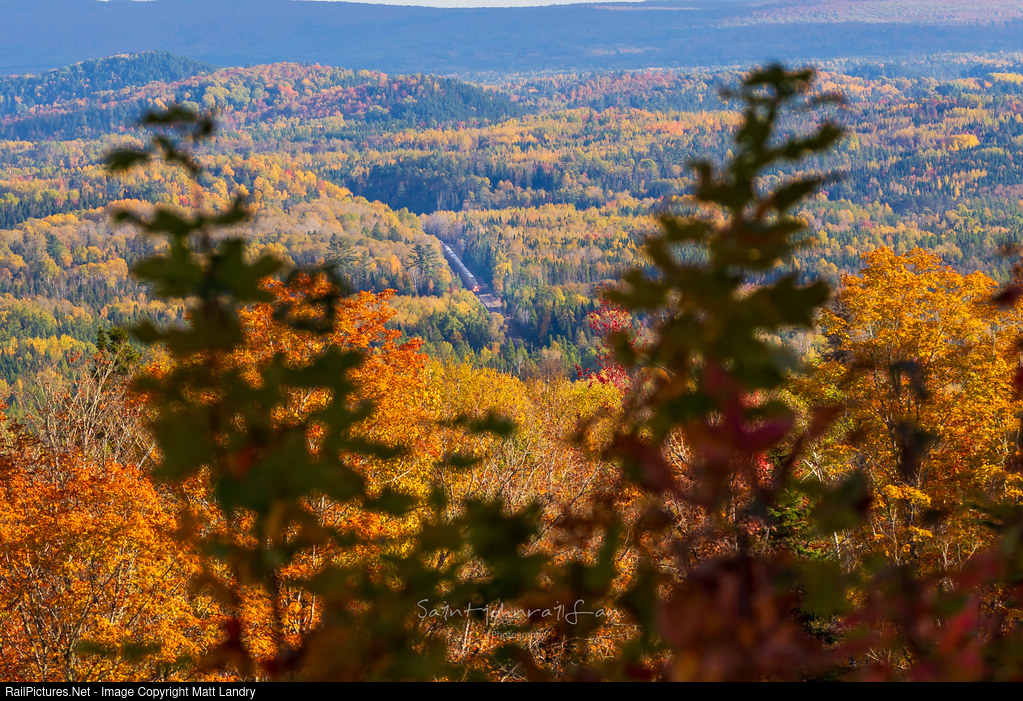 From up on the ridge, CN 305 heads down through the valley at Plaster Rock, New Brunswick. Fall colors are near or at their peak in this are.