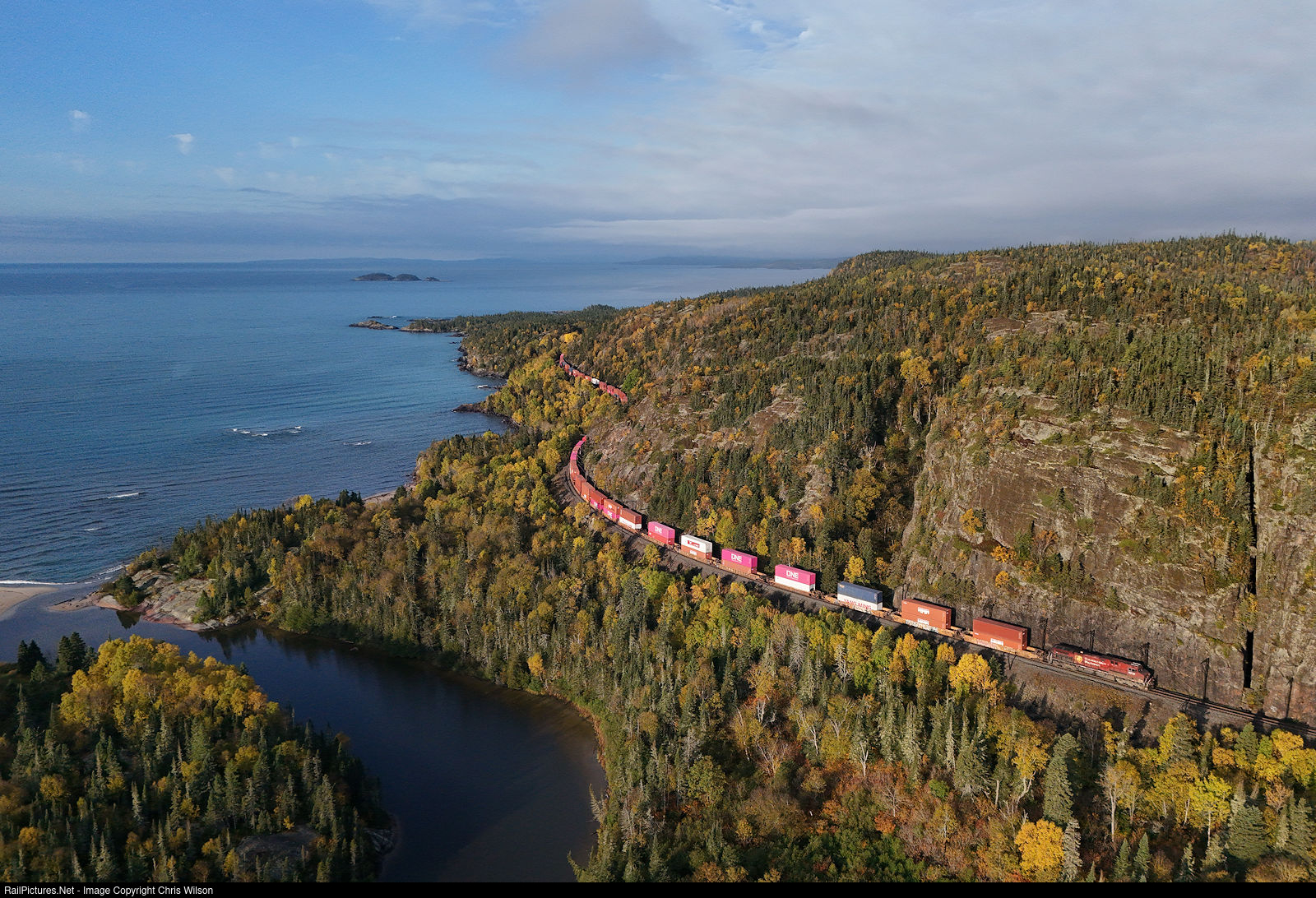 | Vancouver Deltaport, BC to Montreal St Luc, PQ stacks make their way thru the rugged landscape at Neys. |