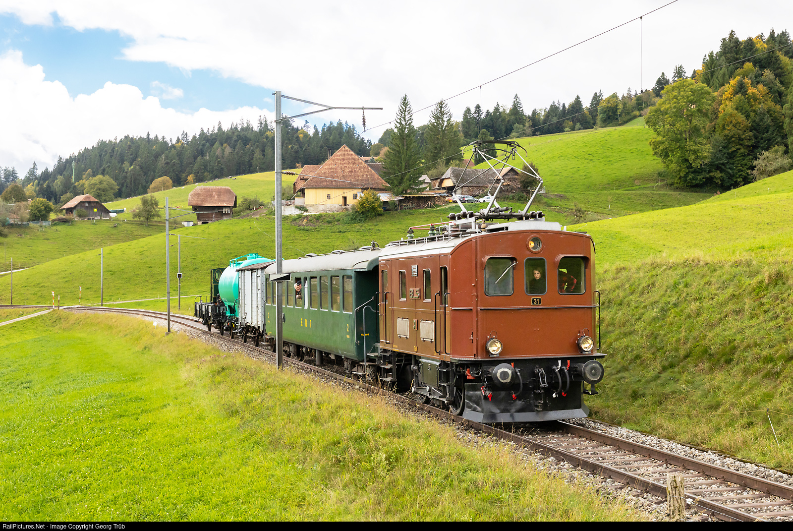 Electric shunter, registered as "tractor", Te 2/3 # 31 of the Verein Historische Eisenbahn Emmental (VHE) in Huttwil, is pulling a mixed passnger/freight train from Summiswald-Grünen to Huttwil, between Gammenthal and Griesbach on the Emmental railway. The vehicle called "Halbesel" (half donkey) was built in 1925 as CFe 2/6 # 784 passenger railcar for the Bern-Lötschberg-Simplon Bahn (BLS), but was converted to Te 2/3 # 31 in 1953 already and then used for freight trains and construction works.