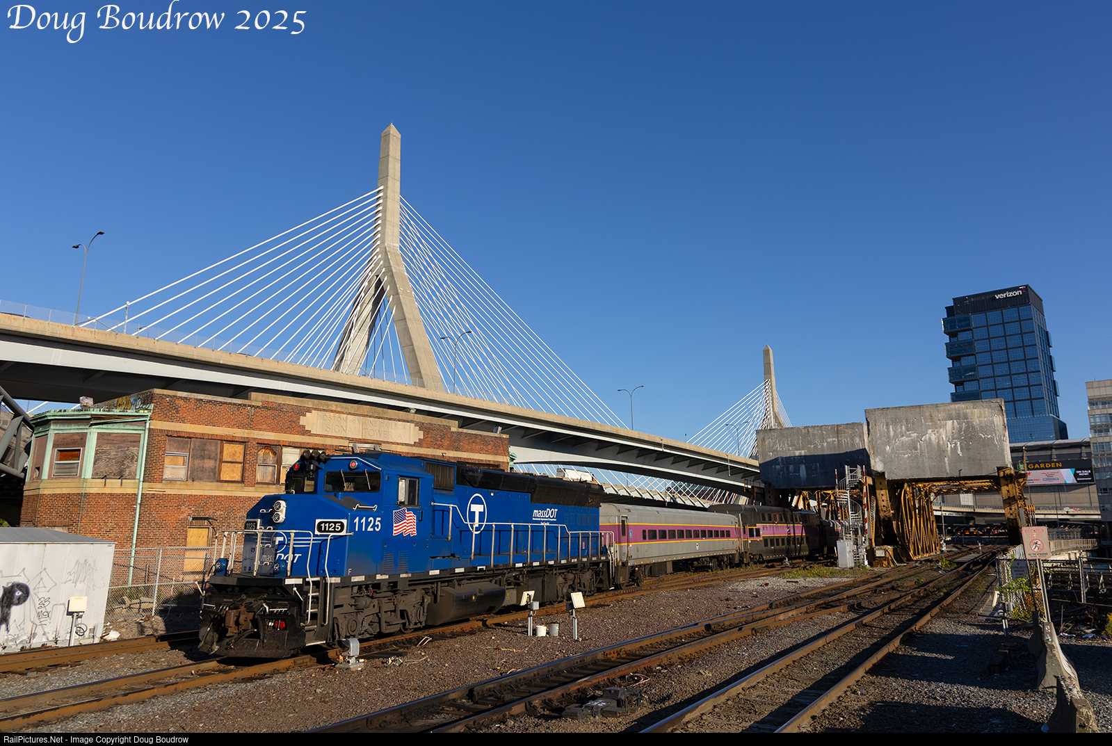 An inbound commuter rail train is passing Tower A and heading into North Station with Massdot painted 1125 shoving.