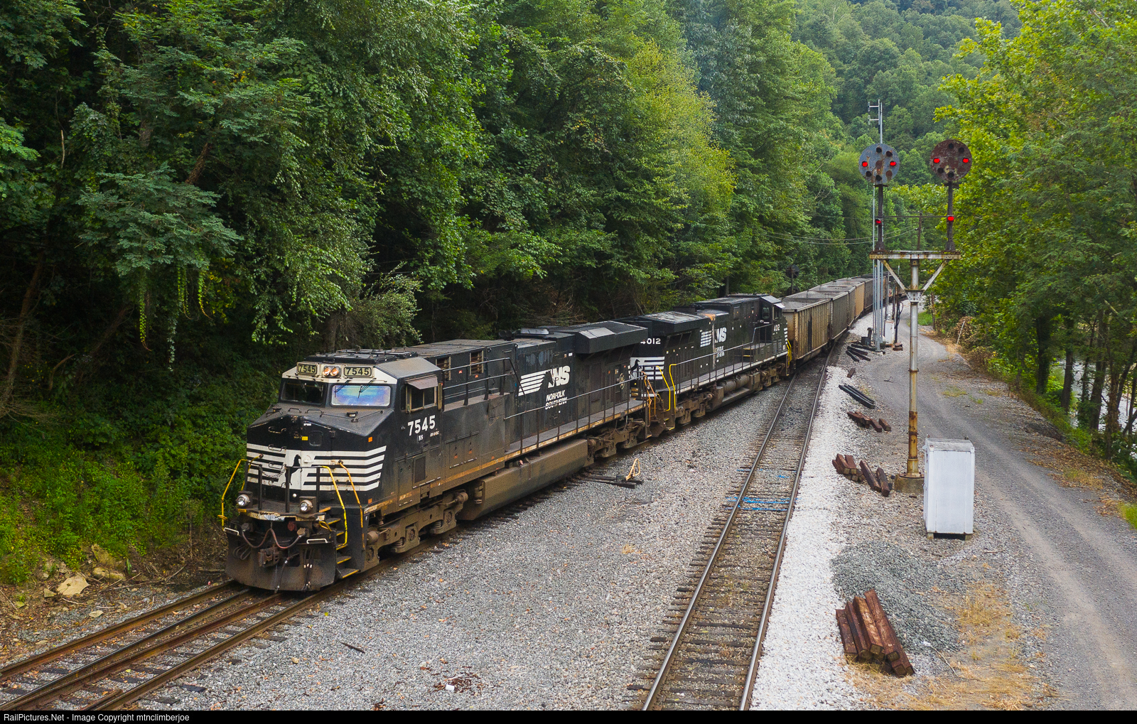 | After stopping for the conductor to throw the switch, Norfolk Southern empty coal train 836 heads into the yard near Deel, Virginia where the train will be tied down to await a crew to take it to the mine for loading. An N&W position light signal still stands guard here at the Anchor control point at the west end of the yard. |