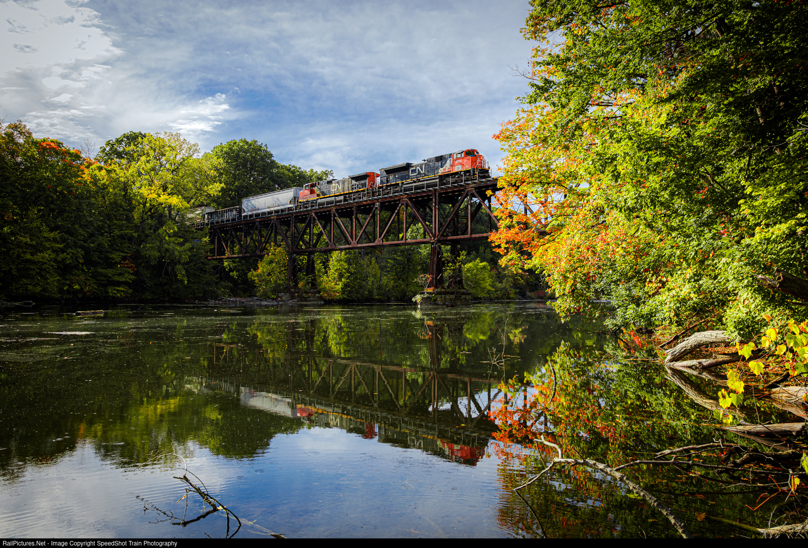 | Rare sighting on the CSX Plymouth Sub Division - CN Run through power leads an Eastbound CSX L303 daily train from Grand Rapids Michigan to Detroit. Here they cross over the Grand River in Grand Ledge. The Fall Color has started to pop along the riverbank ledges |