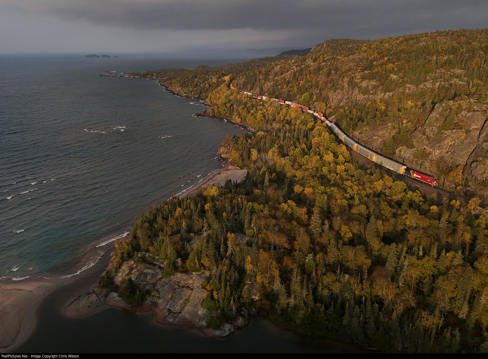 CPKC train 100-01 is eastbound out of Middleton curving along the shores of Lake Superior at the mouth of the Little Pic River