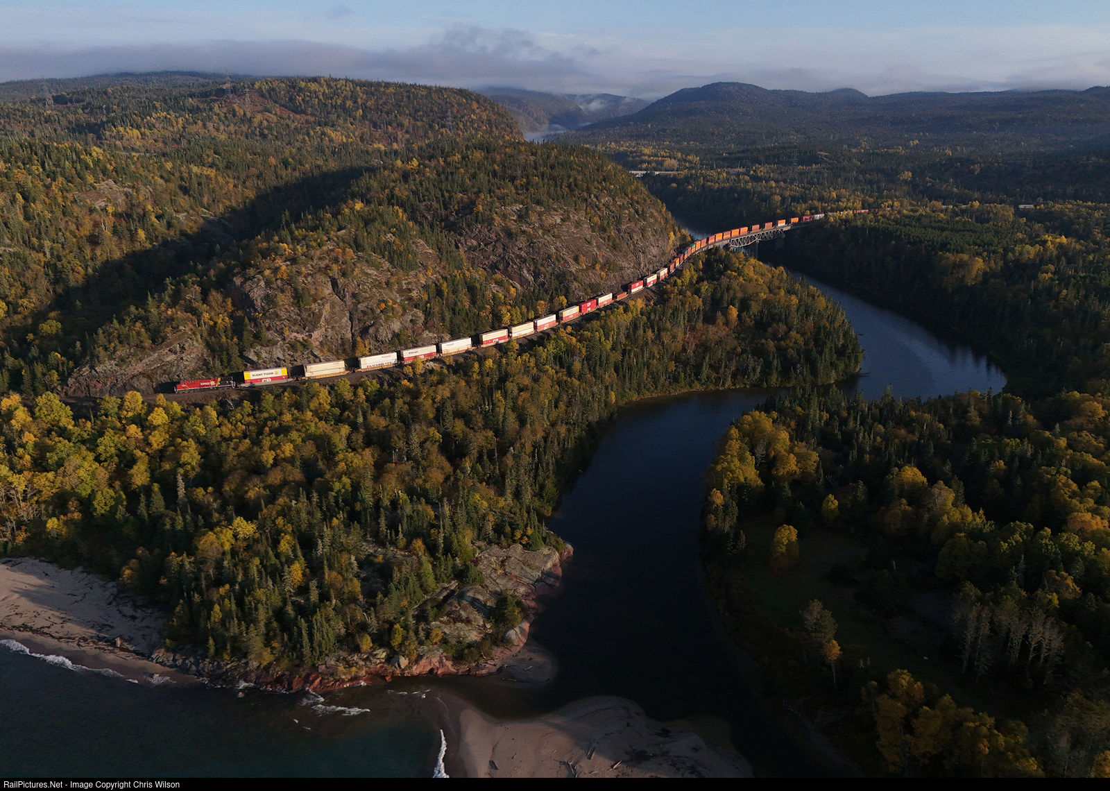 | Another beautiful day is on tap on the north shore of Superior as CPKC train 100 clears the scene crossing the trestle over the Little Pic River. Todays hotshot has a trio of new locomotives, CP 7527, 7512, and 7488 operating 1x1x1. |