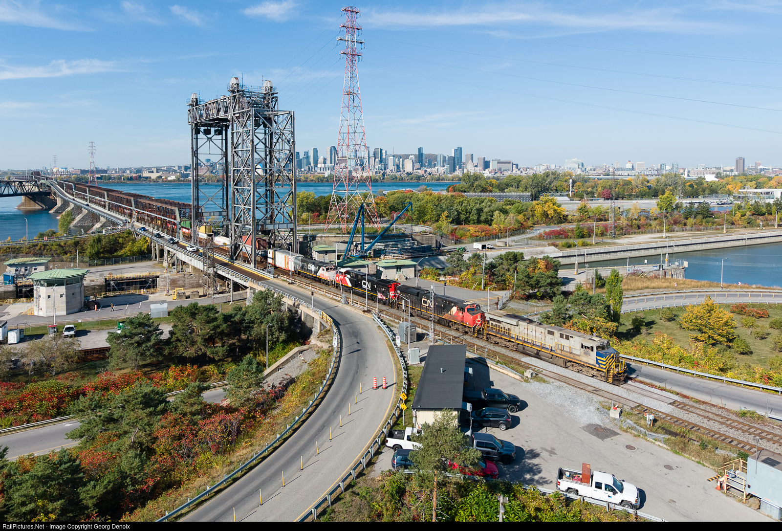 | CN's Halifax-bound intermodal no. 120 comes off the Saint-Lambert-end of the Victoria bridge, crossing the northern draw bridge over the saeway lock on a beautiful October morning. |