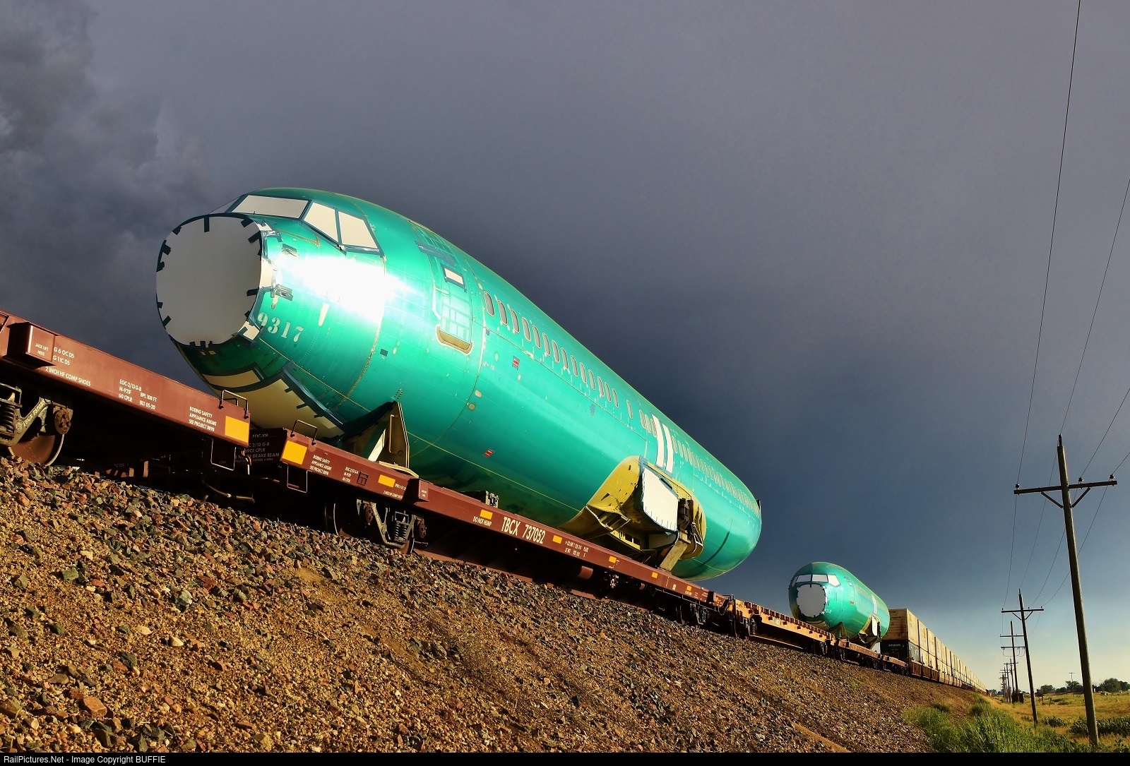 | A summer thunderstorm provides a dynamic background of storm light as a pair of Boeing 737 fuselages run through Hudson, Colorado on the Brush Sub.
