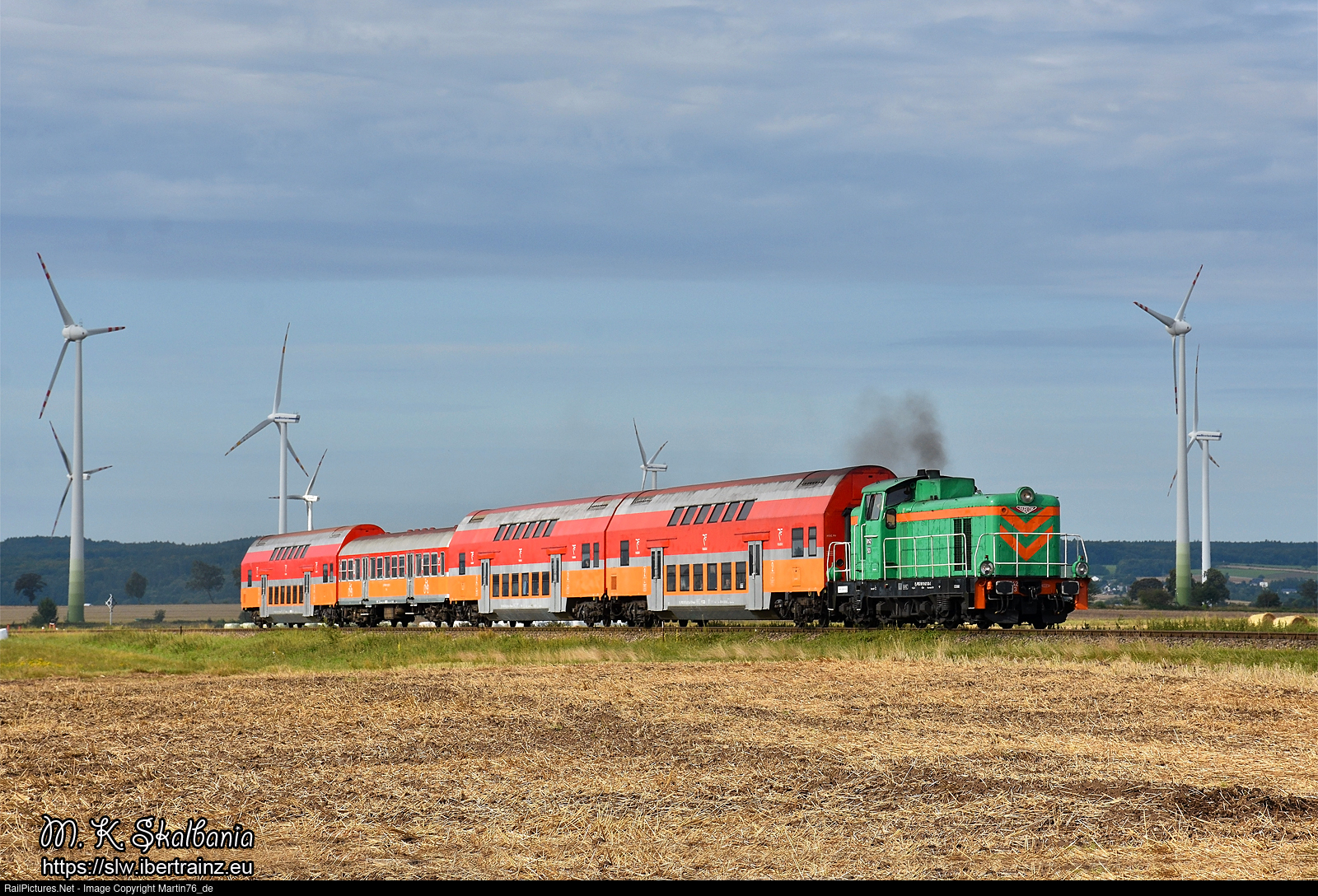The diesel locomotive SM42-523 hauling a passenger train from Gdynia Glowna to Hel.