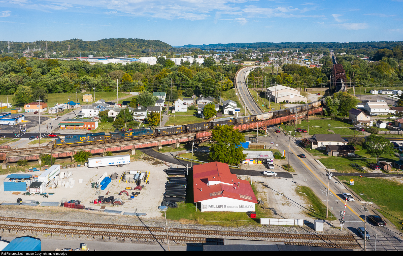 | A pair of GE's lead CSX empty coal train E104 as it crosses the bridge over the Big Sandy river from West Virginia into Catlettsburg, Kentucky and approaches Big Sandy Junction. This train is bound for the yard in Russell, where the cars will be dropped and the power serviced before eventually being routed to a mine for loading. |