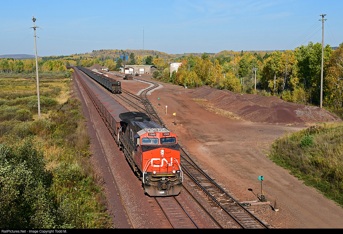 | One on the head end and one as the DPU, two AC44C6Ms are the power bracketing 145 cars running as U791 while they roll pellets from U.S. Steel Minntac's east loadout down the line for CN's yard and dock facilities at Two Harbors, MN. |