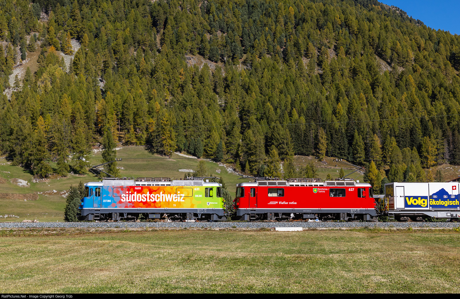 | Ge 4/4 II # 631 of the Rhaetian Railway in the "Südostschweiz" publicity paint scheme and # 627 in multiple control pull the northbound freight train 5140 from Pontresina over the Albula line to Landquart freight yard. |
