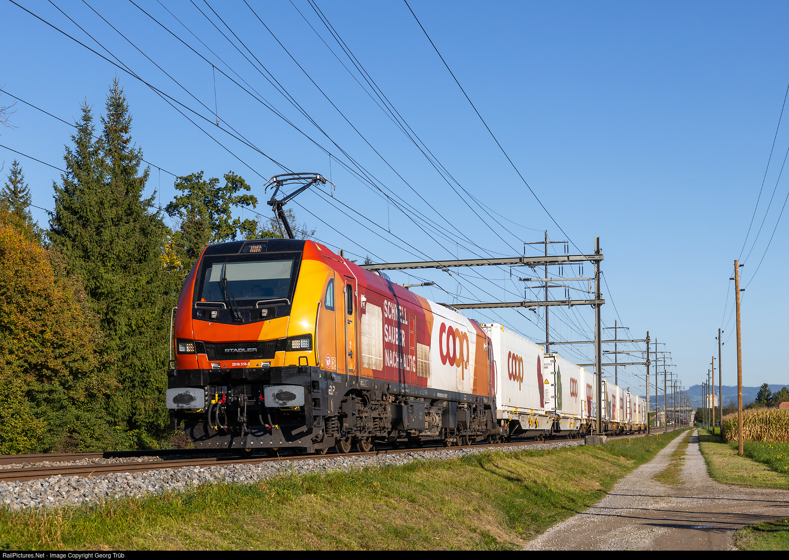 | StadlerRail built "Euro9000" 2019 # 318 of the Railcare railway pulls the Coop intermodal train 63659 from Wangen bei Olten via Solothurn-Biel production yard east-Zollikofen-Thun-Lötschberg base tunnel to Brig, between Wichtrach and Kiesen. |