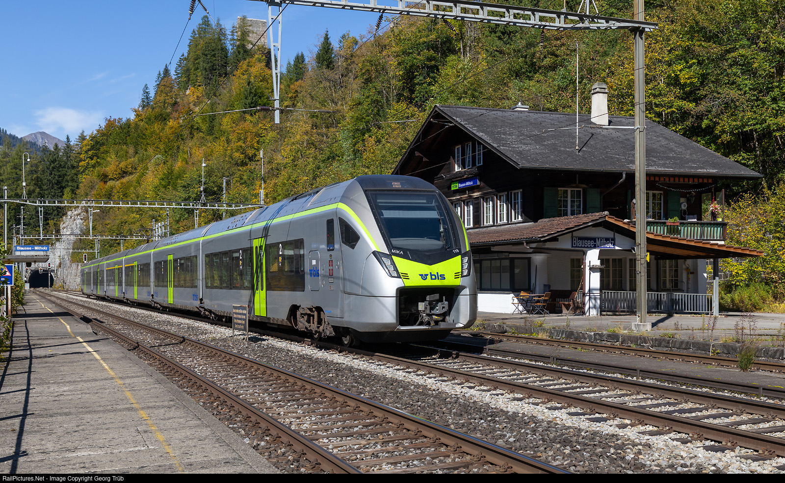 | MIKA RABe 528 # 119 of the BLS is running through Blausee-Mitholz as RE 4270 of the line RE1 from Iselle di Trasquera via Brig-Goppenstein-Kandersteg-Frutigen-Spiez-Thun to Bern. |