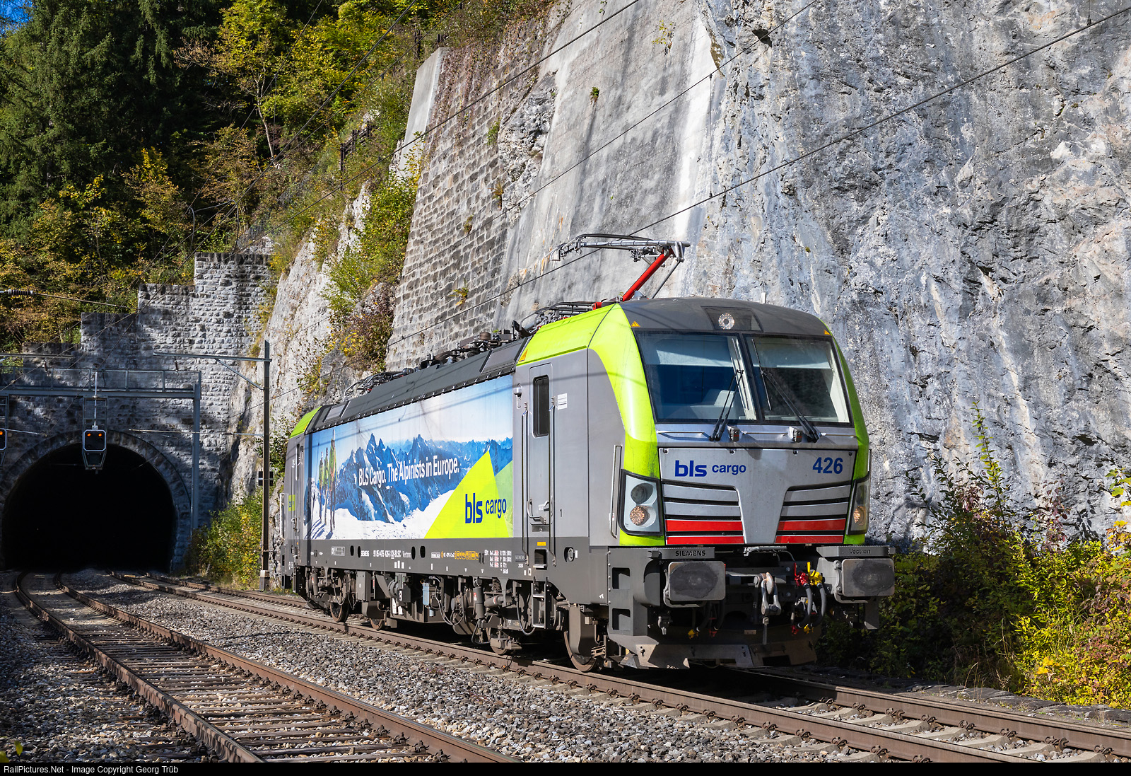 | Siemens "Vectron" Re 475 # 426 of the BLS Cargo is running light through Blausee-Mitholz as train 38224 from Domodossola II shunting yard via Simplon-Lötschberg mountain line to Spiez. |
