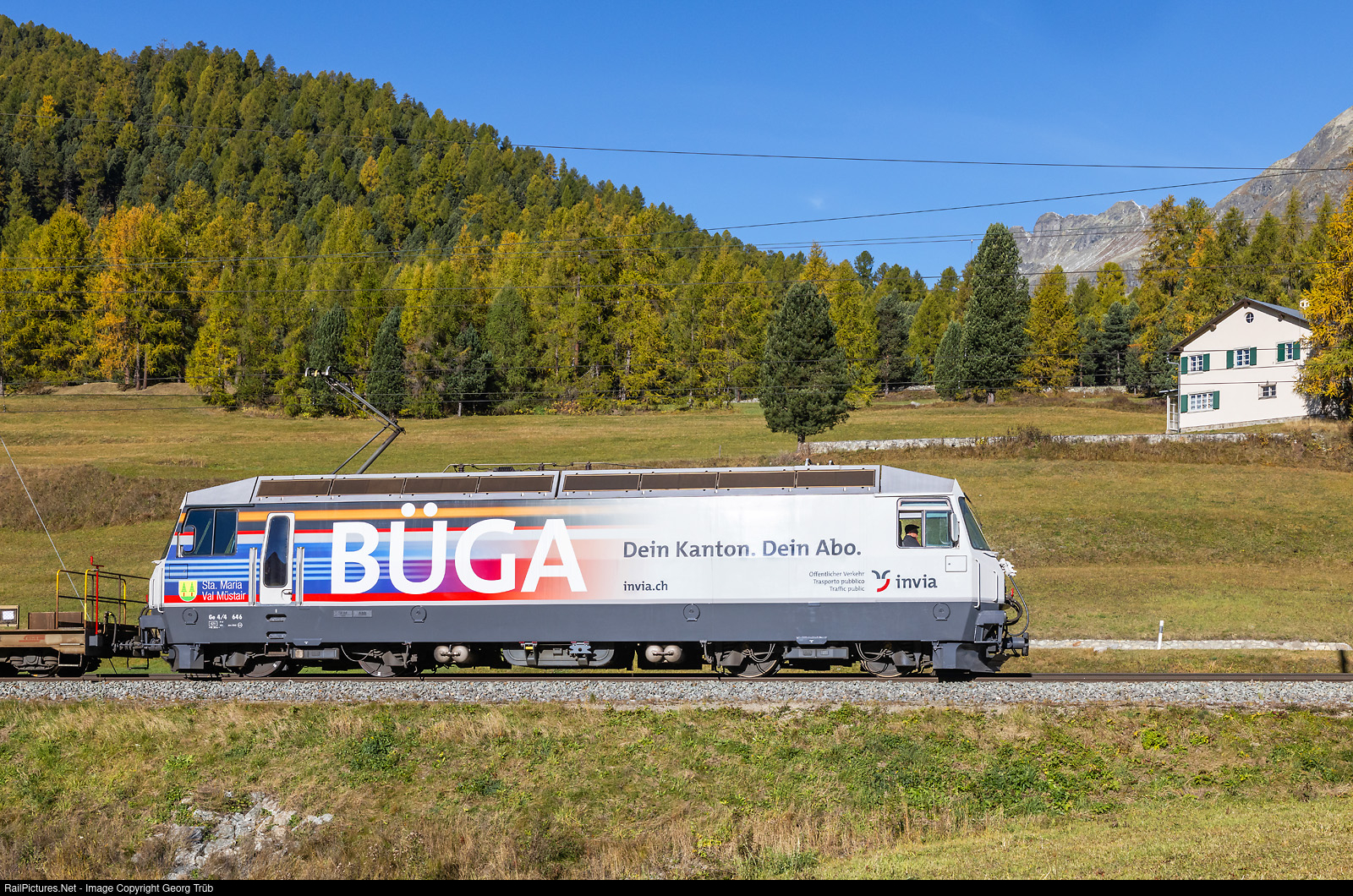 | Ge 4/4 III # 646 of the Rhaetian Railway got a new designed "BÜGA" (Graubünden General Travelcard) publicity paint scheme shortly, and is pulling the freight train 5336 between Samedan and Bever. |