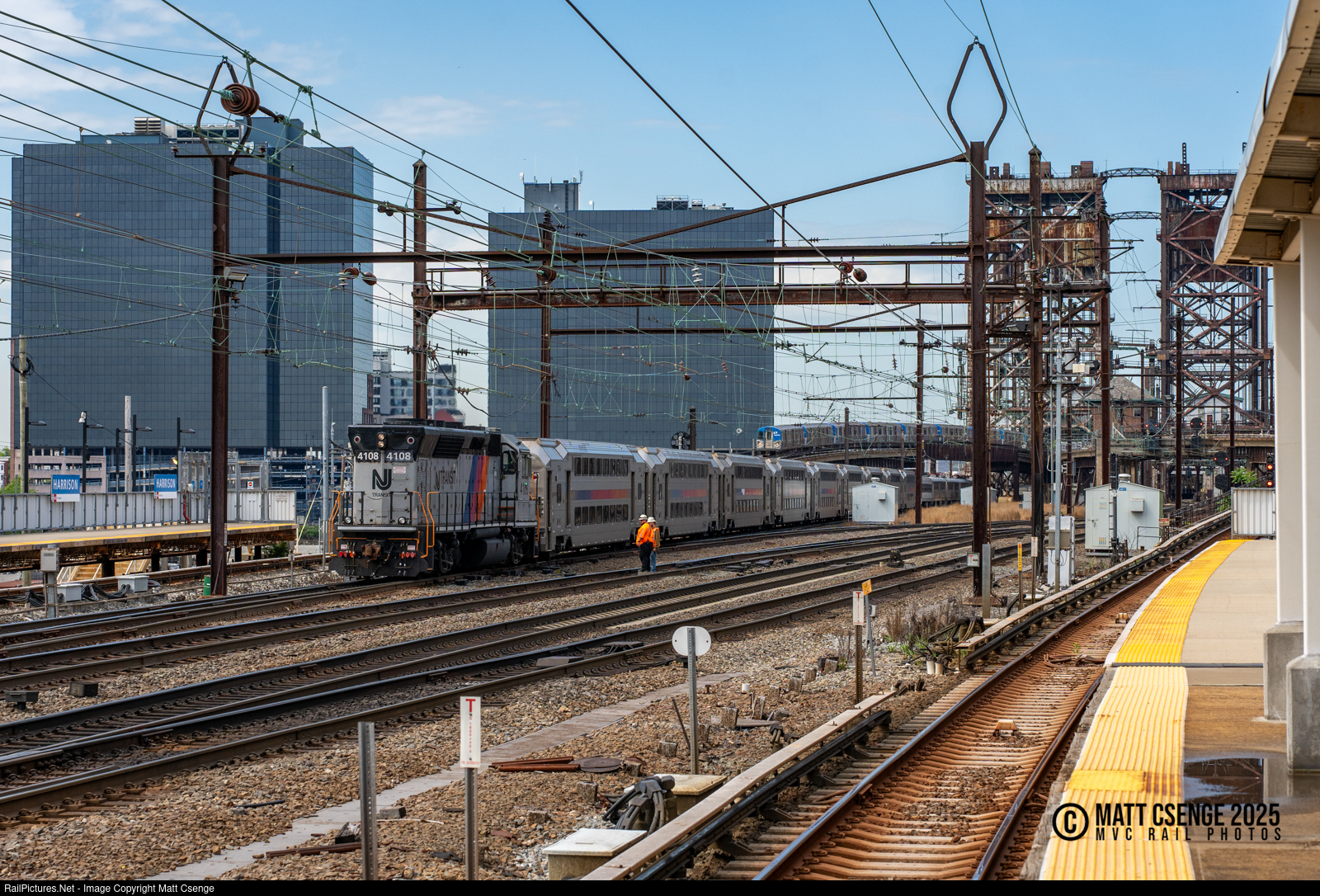 Diesel Duties. NJ Transit GP40PH-2 no. 4108 is seen operating long-hood forward as it hauls train YM32 through Harrison Station on the Northeast Corridor. The train is an as-needed shop move from Morrisville Yard in Pennsylvania to the Meadows Maintenance Complex in Kearny, NJ, which on this day consisted of nine MultiLevel coaches, one Comet, and four Arrow III EMUs.