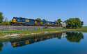 | With an SD70 rebuild leading three GE's, CSX auto train M277 passes by the trilight signal at mile 59 and rolls along a small pond at a farm in Shiloh, Ohio. This train is heading down the Mount Victory Subdivision, after coming west on the New Castle Subdivision and turning at Greenwich. |
