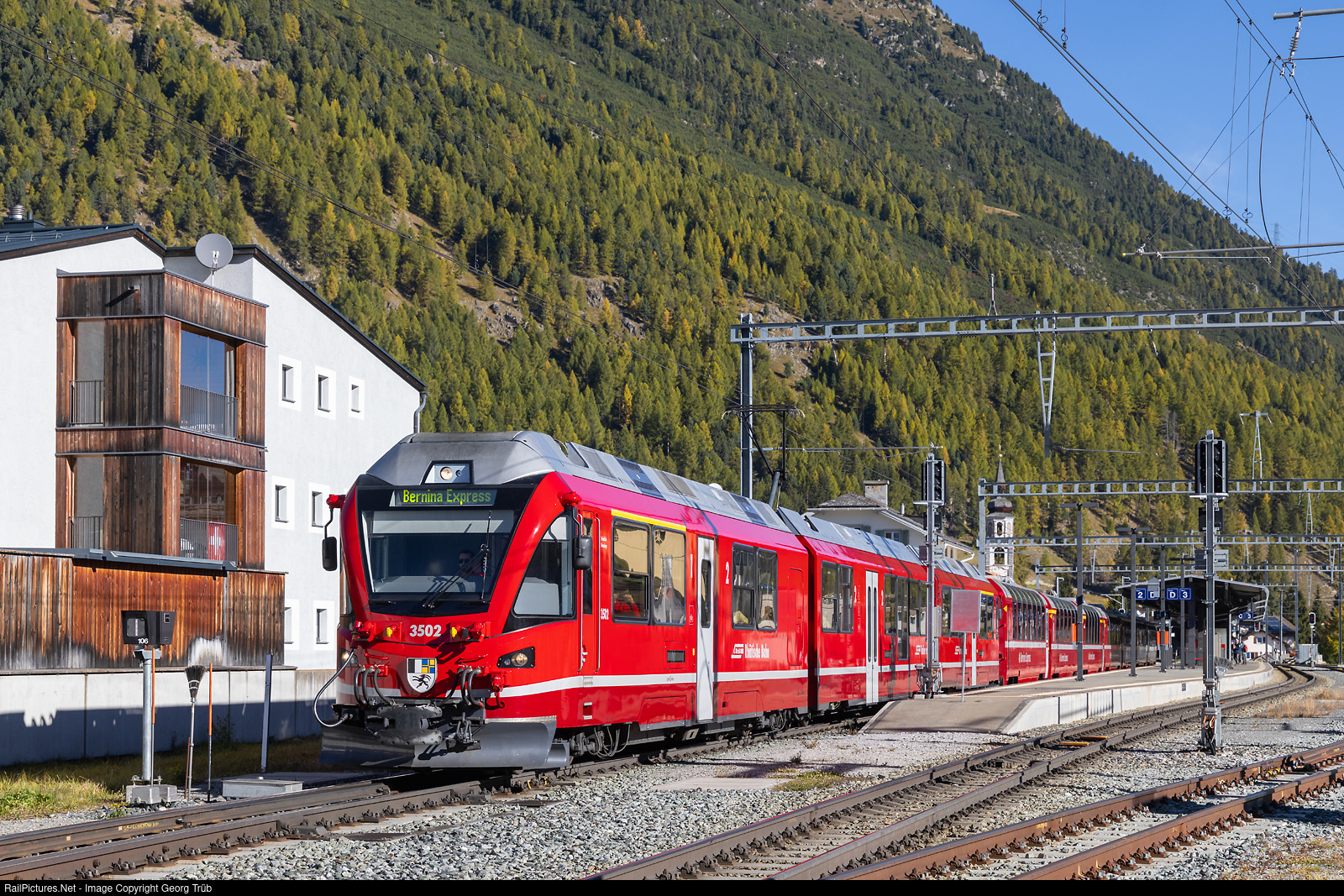 | "Allegra" railcar ABe 8/12 # 3502 of the Rhaetian Railway pulls the PE 951 BERNINA EXPRESS with 7 panorama cars from Chur over the Albula und Bernina world heritage line to Tirano through Beber. |