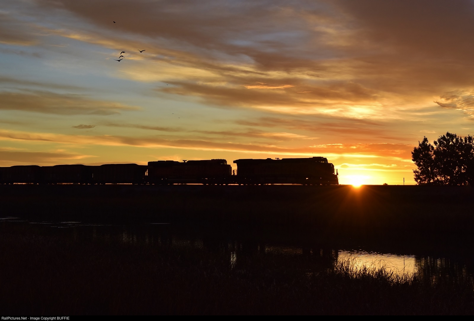 | The geese are flying at sunrise as BNSF 6429 (ES44AC) leads a loaded coal west on the Brush Sub through Barr Lake in Brighton, Colorado. |