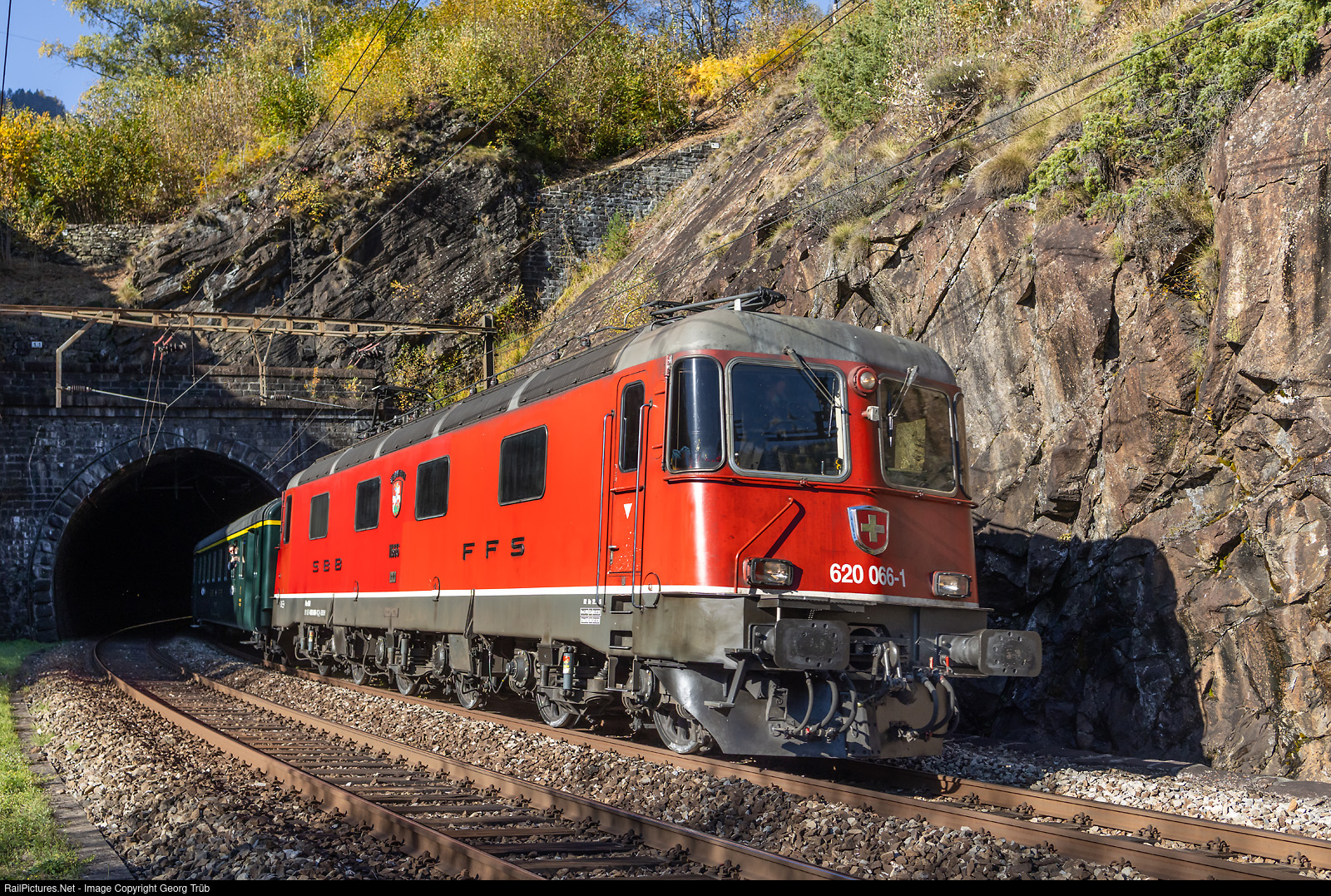 | Re 620 # 066 (Re 6/6 # 11666) "Stein am Rhein" of SBB Historic pulls train 31033 from Erstfeld to Lugano, on the Gotthard south ramp between Rodi-Fiesso and Faido, leaving the 74 meter long Artoito tunnel. |