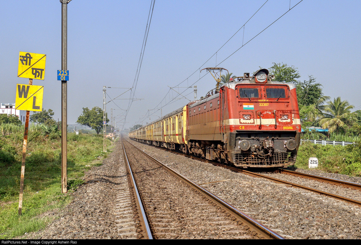 | WAP4 #22307 from Bhusawal shed starts its long journey from Pune with 01415 Pune Gorakhpur special train. The 225 km marker implies the distance of the Central Railway Headquater that is Mumbai (is at a distance of 225 Km from this place), whereas the W/L implies "Whistle Loud" as there is a manned level crossing. |