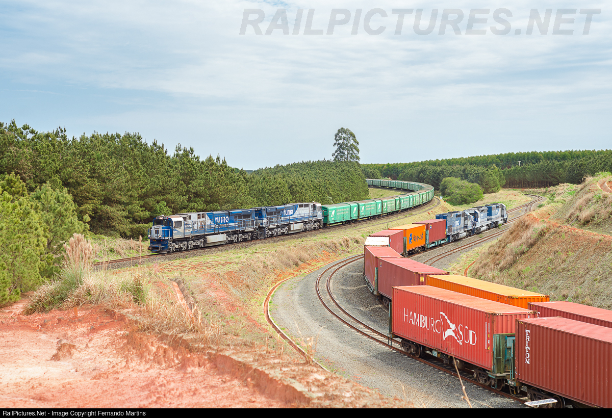 A pair of Rumo ES43BBi locomotives leads an empty pulp train arriving at the Klabin paper plant, meeting a southbound intermodal powered by three SD40s. The trains cross on the scenic curves surrounded by pine forests near Ortigueira, Paraná, on September 7, 2025.