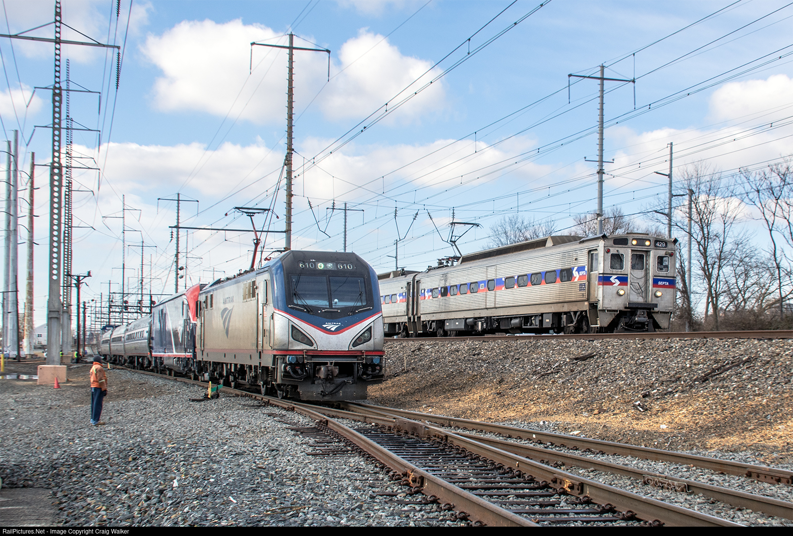 Southeastern Pennsylvania Transportation Authority (SEPTA) train 9212, consisting of GE Silverliner IV EMU cars (with SEPA 429 on the point) rushes past an Amtrak test train being assembled at Amtrak's Wilmington Maintenance Facility. This Amtrak train has ACS-64 (built 3/14) 610 and ALC-42 317 (built 10/22) for power (and the cars are 82627, 82576 and 82807) … for now. In a short while, GP38 722 will be added to the train's rear, and then the Geep will be replaced by 319. (Wilmington, Delaware – February 1, 2023). Photographed on railroad property with permission and full PPE.