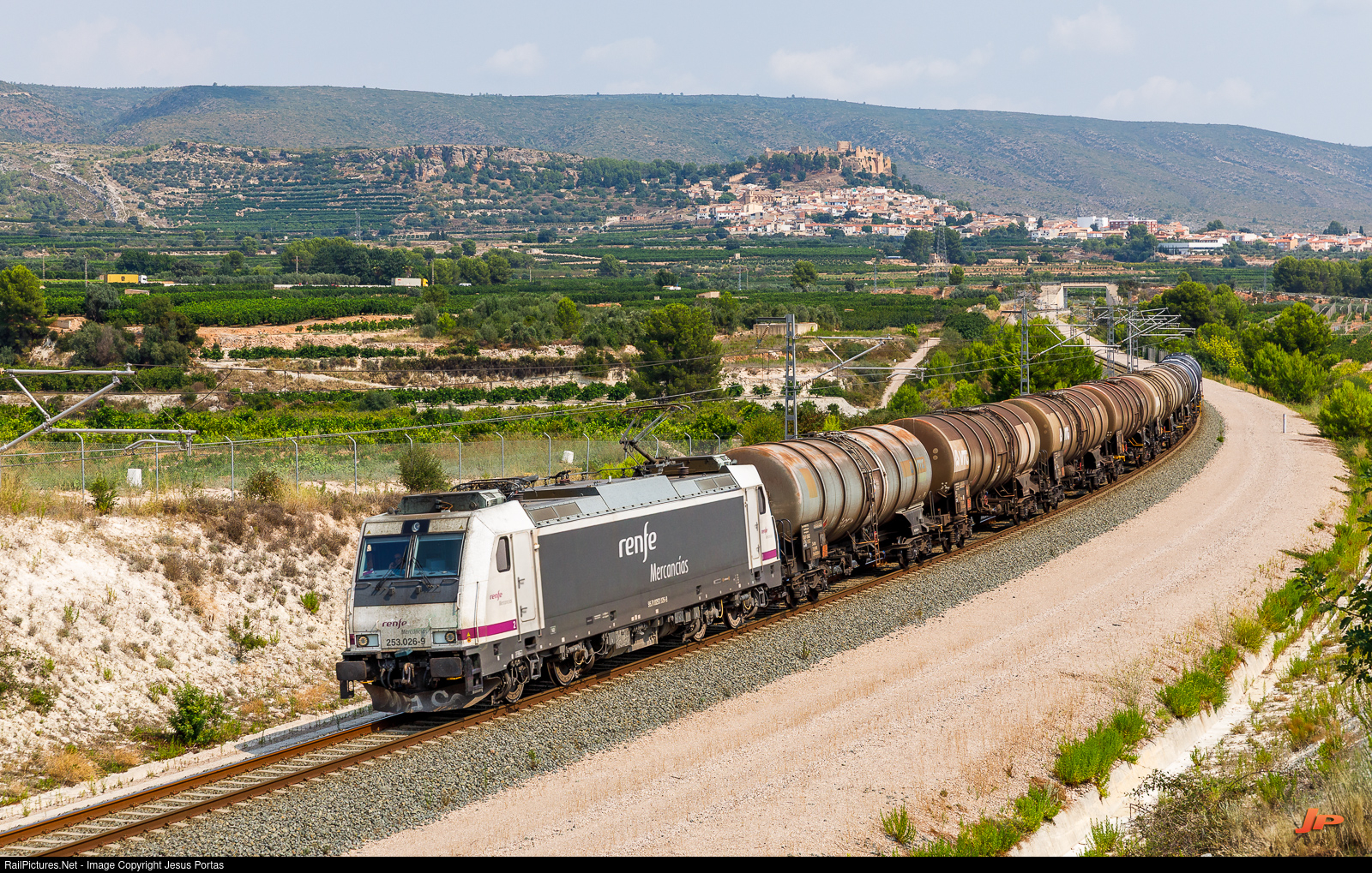 Renfe MercancĂas 253.026-9 with a tanker train.