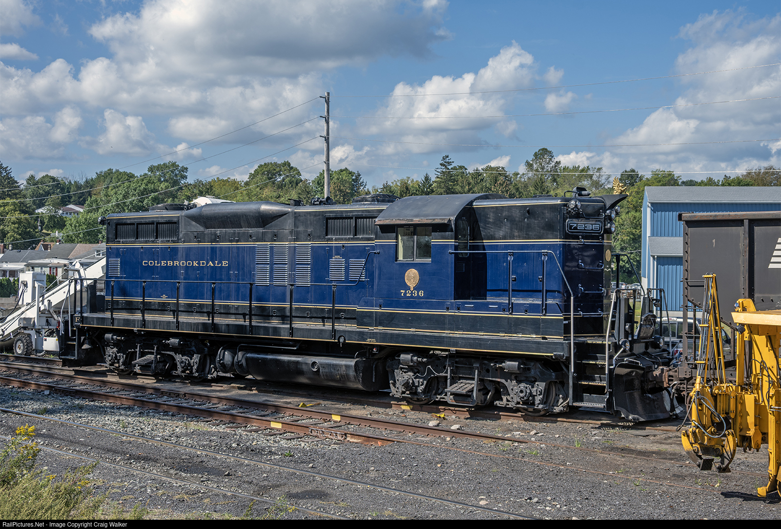 Colebrookdale Railroad Preservation Trust (EBGX) operates the Colebrookdale Railroad. Besides the railroad’s scenic railroad ride, it also handles freight. EBGX "GP10" 7236 is seen here placing hopper cars for unloading. Built by EMD as Pennsylvania Railroad GP9 7236. When the PRR and New York Central it became Penn Central 7236. After another merger, it became Conrail 7236. (All three railroads must’ve like that number, as it hadn't changed … until CR rebuilt it into a "GP10" and numbered it 7587.) After CR tired of it, they sold it to Winchester & Western, as WW 575. From there it was sold to Colebrookdale as EBGX 7236, which painted it in a very impressive paint scheme. (Boyertown, Pennsylvania - September 26, 2025)